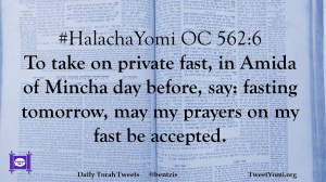 #HalachaYomi OC 562:6 To take on private fast, in Amida of Mincha day before, say: fasting tomorrow, may my prayers on my fast be accepted.