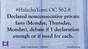 #HalachaYomi OC 562:8 Declared nonconsecutive private fasts (Monday, Thursday, Monday), debate if 1 declaration enough or if need for each.