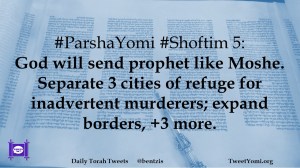 #ParshaYomi #Shoftim 5: God will send prophet like Moshe. Separate 3 cities of refuge for inadvertent murderers; expand borders, +3 more.