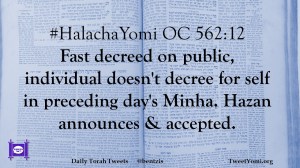 #HalachaYomi OC 562:12 Fast decreed on public, individual doesn’t decree for self in preceding day’s Minha. Hazan announces & accepted.