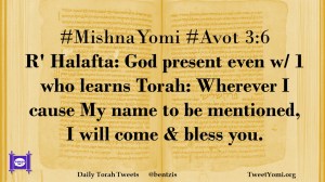#MishnaYomi #Avot 3:6 R’ Halafta: God present even w/ 1 who learns Torah: Wherever I cause My name to be mentioned, I will come & bless you.