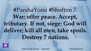 #ParshaYomi #Shoftim 7: War: offer peace. Accept, tributary. If not, siege; God will deliver; kill all men, take spoils. Destroy 7 nations.