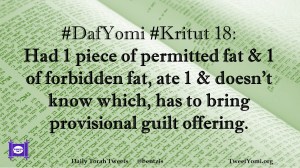 DafYomi, Kritut #DafYomi #Kritut 18 Date: September 8, 2019Author: ysspitz #DafYomi #Kritut 18: Had 1 piece of permitted fat & 1 of forbidden fat, ate 1 & doesn’t know which, has to bring provisional guilt offering. Share this: Share on X (Opens in new window) X Share on Facebook (Opens in new window) Facebook Like Loading... Related
