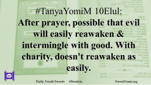 #TanyaYomiM 10Elul: After prayer, possible that evil will easily reawaken & intermingle with good. With charity, doesn’t reawaken as easily.