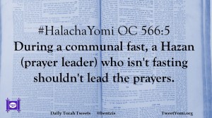 HalachaYomi #HalachaYomi OC 566:5 Date: September 12, 2019Author: ysspitz #HalachaYomi OC 566:5 During a communal fast, a Hazan (prayer leader) who isn’t fasting shouldn’t lead the prayers. Share this: Share on X (Opens in new window) X Share on Facebook (Opens in new window) Facebook Like Loading... Related