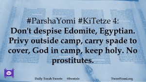 #ParshaYomi #KiTetze 4: Don’t despise Edomite, Egyptian. Privy outside camp, carry spade to cover, God in camp, keep holy. No prostitutes.