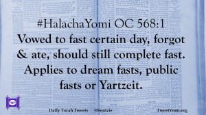 #HalachaYomi OC 568:1 Vowed to fast certain day, forgot & ate, should still complete fast. Applies to dream fasts, public fasts or Yartzeit.