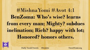 #MishnaYomi #Avot 4:1 BenZoma: Who’s wise? learns from every man; Mighty? subdues inclination; Rich? happy with lot; Honored? honors others.