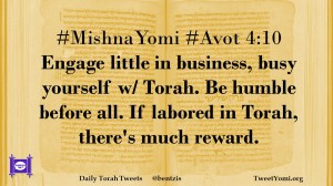 #MishnaYomi #Avot 4:10 Engage little in business, busy yourself w/ Torah. Be humble before all. If labored in Torah, there’s much reward.