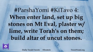 #ParshaYomi #KiTavo 4: When enter land, set up big stones on Mt Eval, plaster w/ lime, write Torah’s on them; build altar of uncut stones.