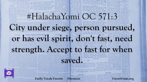 #HalachaYomi OC 571:3 City under siege, person pursued, or has evil spirit, don’t fast, need strength. Accept to fast for when saved.