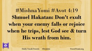 #MishnaYomi #Avot 4:19 Shmuel Hakatan: Don’t exult when your enemy falls or rejoice when he trips, lest God see & turn His wrath from him.