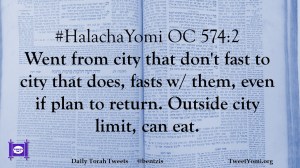 #HalachaYomi OC 574:2 Went from city that don’t fast to city that does, fasts w/ them, even if plan to return. Outside city limit, can eat.