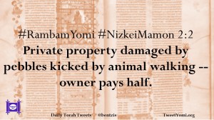 NizkeiMamon, RambamYomi #RambamYomi #NizkeiMamon 2:2 Date: September 22, 2019Author: ysspitz #RambamYomi #NizkeiMamon 2:2 Private property damaged by pebbles kicked by animal walking — owner pays half. Share this: Share on X (Opens in new window) X Share on Facebook (Opens in new window) Facebook Like Loading... Related