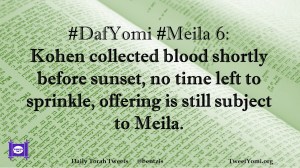 DafYomi, Meila #DafYomi #Meila 6 Date: September 23, 2019Author: ysspitz #DafYomi #Meila 6: Kohen collected blood shortly before sunset, no time left to sprinkle, offering is still subject to Meila. Share this: Share on X (Opens in new window) X Share on Facebook (Opens in new window) Facebook Like Loading... Related