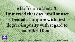 DafYomi, Meila #DafYomi #Meila 8 Date: September 25, 2019Author: ysspitz #DafYomi #Meila 8: Immersed that day, until sunset is treated as impure with first-degree impurity with regard to sacrificial food. Share this: Share on X (Opens in new window) X Share on Facebook (Opens in new window) Facebook Like Loading... Related
