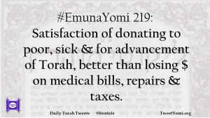 #EmunaYomi 219: Satisfaction of donating to poor, sick & for advancement of Torah, better than losing $ on medical bills, repairs & taxes.