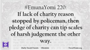 #EmunaYomi 220: If lack of charity reason stopped by policeman, then pledge of charity can tip scales of harsh judgement the other way.