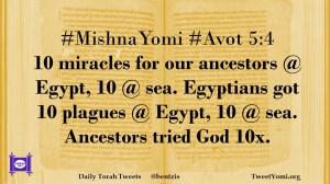 #MishnaYomi #Avot 5:4 10 miracles for our ancestors @ Egypt, 10 @ sea. Egyptians got 10 plagues @ Egypt, 10 @ sea. Ancestors tried God 10x.