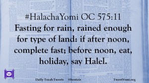 #HalachaYomi OC 575:11 Fasting for rain, rained enough for type of land: if after noon, complete fast; before noon, eat, holiday, say Halel.