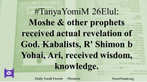 #TanyaYomiM 26Elul: Moshe & other prophets received actual revelation of God. Kabalists, R’ Shimon b Yohai, Ari, received wisdom, knowledge.