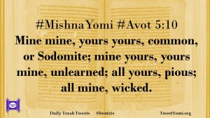 #MishnaYomi #Avot 5:10 Mine mine, yours yours, common, or Sodomite; mine yours, yours mine, unlearned; all yours, pious; all mine, wicked.