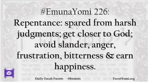 #EmunaYomi 226: Repentance: spared from harsh judgments; get closer to God; avoid slander, anger, frustration, bitterness & earn happiness.