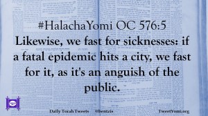 #HalachaYomi OC 576:5 Likewise, we fast for sicknesses: if a fatal epidemic hits a city, we fast for it, as it’s an anguish of the public.