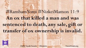 #RambamYomi #NizkeiMamon 11:9 An ox that killed a man and was sentenced to death, any sale, gift or transfer of ox ownership is invalid.