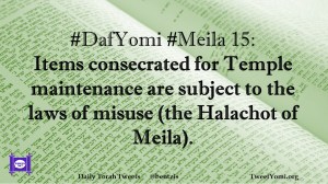 DafYomi, Meila #DafYomi #Meila 15 Date: October 2, 2019Author: ysspitz #DafYomi #Meila 15: Items consecrated for Temple maintenance are subject to the laws of misuse (the Halachot of Meila). Share this: Share on X (Opens in new window) X Share on Facebook (Opens in new window) Facebook Like Loading... Related