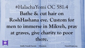 #HalachaYomi OC 581:4 Bathe & cut hair on RoshHashana eve. Custom for men to immerse in Mikveh, pray at graves, give charity to poor there.