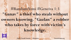 #RambamYomi #Geneiva 1:3 “Ganav” a thief who steals without owners knowing. “Gazlan” a robber who takes by force with victim’s knowledge.