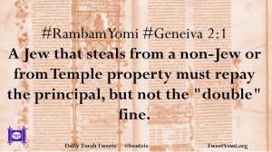 #RambamYomi #Geneiva 2:1 A Jew that steals from a non-Jew or from Temple property must repay the principal, but not the “double” fine.