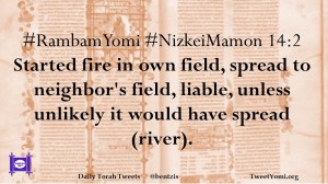 #RambamYomi #NizkeiMamon 14:2 Started fire in own field, spread to neighbor’s field, liable, unless unlikely it would have spread (river).