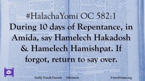 #HalachaYomi OC 582:1 During 10 days of Repentance, in Amida, say Hamelech Hakadosh & Hamelech Hamishpat. If forgot, return to say over.