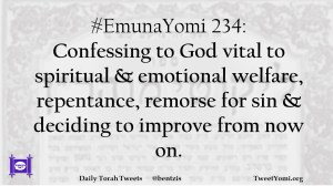 #EmunaYomi 234: Confessing to God vital to spiritual & emotional welfare, repentance, remorse for sin & deciding to improve from now on.