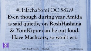 #HalachaYomi OC 582:9 Even though during year Amida is said quietly, on RoshHashana & YomKipur can be out loud. Have Machzors, so won’t err.