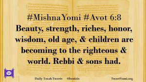 #MishnaYomi #Avot 6:8 Beauty, strength, riches, honor, wisdom, old age, & children are becoming to the righteous & world. Rebbi & sons had.
