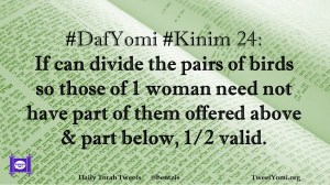 DafYomi, Kinim #DafYomi #Kinim 24 Date: October 11, 2019Author: ysspitz #DafYomi #Kinim 24: If can divide the pairs of birds so those of 1 woman need not have part of them offered above & part below, 1/2 valid. Share this: Share on X (Opens in new window) X Share on Facebook (Opens in new window) Facebook Like Loading... Related