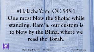 #HalachaYomi OC 585:1 One most blow the Shofar while standing. Ram”a: our custom is to blow by the Bima, where we read the Torah.