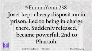 #EmunaYomi 238: Josef kept cheery disposition in prison. Led to being in charge there. Suddenly released, became powerful, 2nd to Pharaoh.