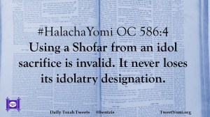 HalachaYomi #HalachaYomi OC 586:4 Date: October 13, 2019Author: ysspitz #HalachaYomi OC 586:4 Using a Shofar from an idol sacrifice is invalid. It never loses its idolatry designation. Share this: Share on X (Opens in new window) X Share on Facebook (Opens in new window) Facebook Like Loading... Related