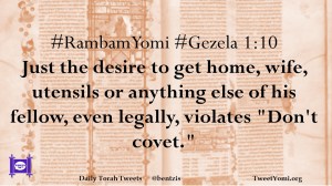 #RambamYomi #Gezela 1:10 Just the desire to get home, wife, utensils or anything else of his fellow, even legally, violates “Don’t covet.”