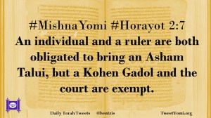 #MishnaYomi #Horayot 2:7 An individual and a ruler are both obligated to bring an Asham Talui, but a Kohen Gadol and the court are exempt.