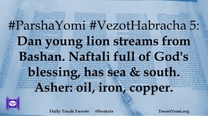 #ParshaYomi #VezotHabracha 5: Dan young lion streams from Bashan. Naftali full of God’s blessing, has sea & south. Asher: oil, iron, copper.