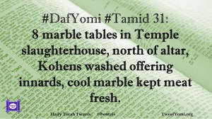 DafYomi, Tamid #DafYomi #Tamid 31 Date: October 18, 2019Author: ysspitz #DafYomi #Tamid 31: 8 marble tables in Temple slaughterhouse, north of altar, Kohens washed offering innards, cool marble kept meat fresh. Share this: Share on X (Opens in new window) X Share on Facebook (Opens in new window) Facebook Like Loading... Related