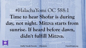 #HalachaYomi OC 588:1 Time to hear Shofar is during day, not night. Mitzva starts from sunrise. If heard before dawn, didn’t fulfill Mitzva.