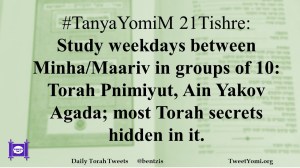 #TanyaYomiM 21Tishre: Study weekdays between Minha/Maariv in groups of 10: Torah Pnimiyut, Ain Yakov Agada; most Torah secrets hidden in it.
