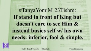 #TanyaYomiM 23Tishre: If stand in front of King but doesn’t care to see Him & instead busies self w/ his own needs: inferior, fool & simple.