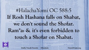 #HalachaYomi OC 588:5 If Rosh Hashana falls on Shabat, we don’t sound the Shofar. Ram”a: & it’s even forbidden to touch a Shofar on Shabat.